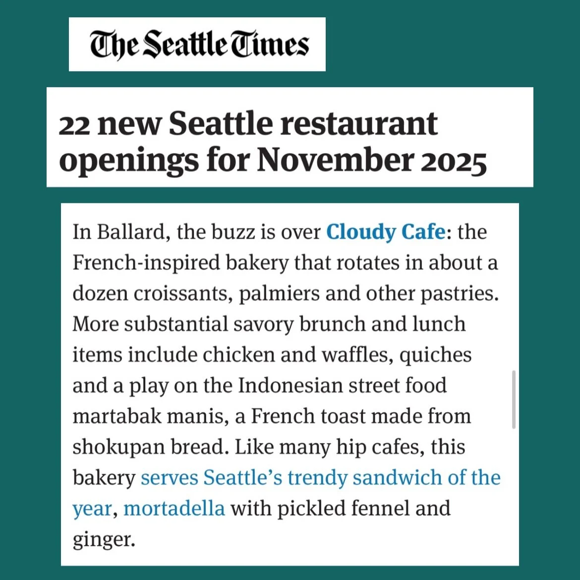 Don't let the name fool you — chef Dionne "Cloudy" Himmelfarb is bringing big energy, bold flavors, and warm bakery smells to the heart of Ballard. A longtime force in Seattle's food scene (Mt. Joy, Canlis, Ethan Stowell Restaurants), Dionne's finally doing her own thing: a cozy, pastry-forward cafe serving up your favorite breads and breakfast staples, with just a touch of her Indonesian roots. Cloudy Cafe is comfort food with a wink. We can't wait to welcome you in.