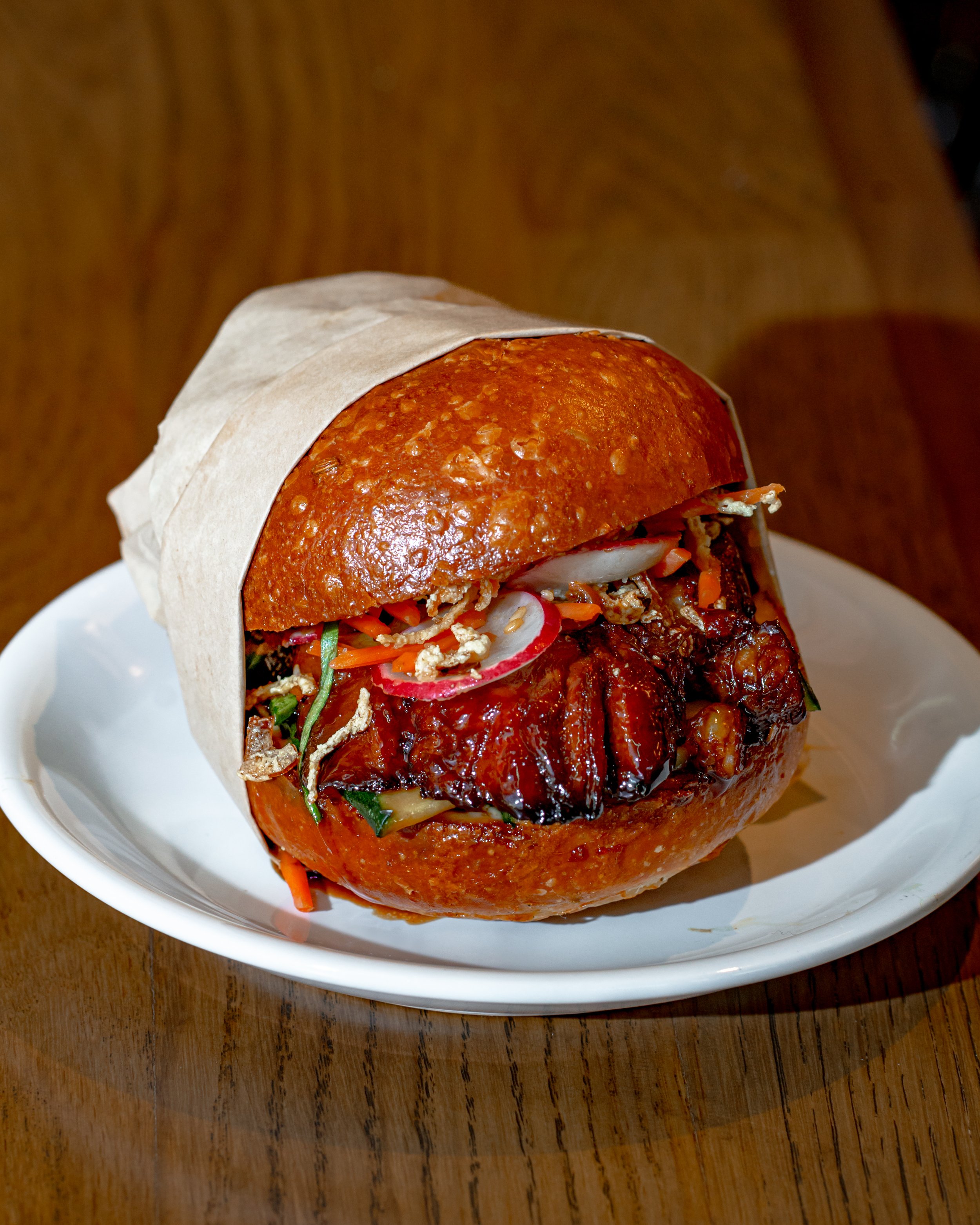 Pork Belly cooked to perfection, pickled veggies (radish, carrots and green onions), smeared with a sweet soy aioli, thinly sliced cucumbers, crispy shallots and drizzled with chili oiles here